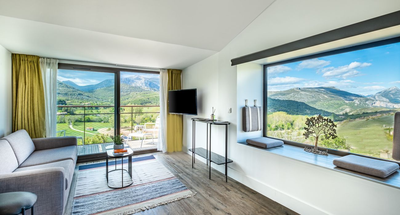 It is comprised of a separate room and a lounge decorated with an olive theme. The room has a 180 cm double bed and a private balcony and the lounge has a sofa bed for 1 or 2 people. Bathroom with a bathtub and italian shower. Separate toilets.